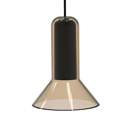 Die Hängeleuchte Corpa Bass besteht aus einem schwarzen Pendel aus Aluminium und einem Glasschirm, der sich im unteren Teil abgeschrägt vergrößert und auf das Pendel aufgesetzt wird, so dass der Glasschirm im oberen Teil auf der Fassung sitzt und lediglich der untere Teil übersteht. In die Fassung kann ein frei wählbares GU10-Leuchtmittel eingesetzt werden, so dass sich Lichtfarbe und Abstrahlwinkel an die jeweiligen Gegebenheiten anpassen lassen. Die transparente, blasse Farbe und die klassische Form machen die Pendelleuchte zu einer Lichtquelle, die sich sich mit Leichtigkeit vor allem in moderne oder puristische Einrichtungen einfügen lässt. Über einem langen Tisch oder einer Theke bietet sich die Montage von mehreren Leuchten an.