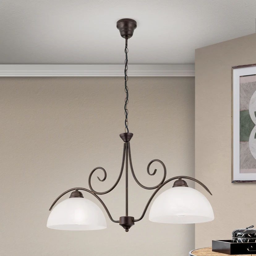 Im eleganten Landhausstil ist die Hängeleuchte Marco gehalten, die aus einem antik-braunen Gestell mit zwei alabasterfarbenen Glasschirmen besteht, die für behagliches Licht sorgen.