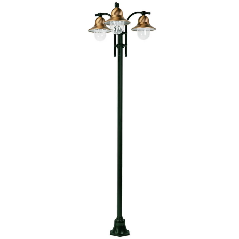 Mastleuchte Toscane sorgt mit drei kupferfarbenen Schirmes für helles Licht