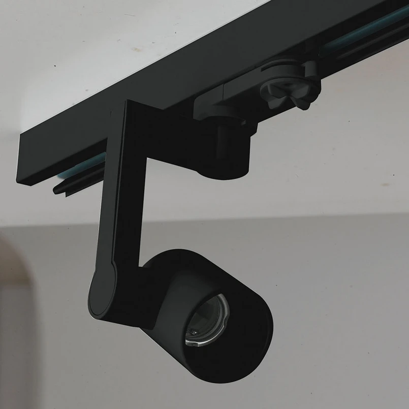 In schlichter, moderner Form ist der Strahler Express gestaltet. Die Befestigungen des Arms und des zylindrischen Kopfs bieten die Möglichkeit, das Licht auf den gewünschten Bereich zu richten; hinzu kommt die Flexibilität des beweglichen Schienenschlittens. Express nimmt eine E27-Lampe auf; angesichts der im Kopf liegenden Fassung ist bei der Auswahl des Leuchtmittels auf dessen Maße zu achten.