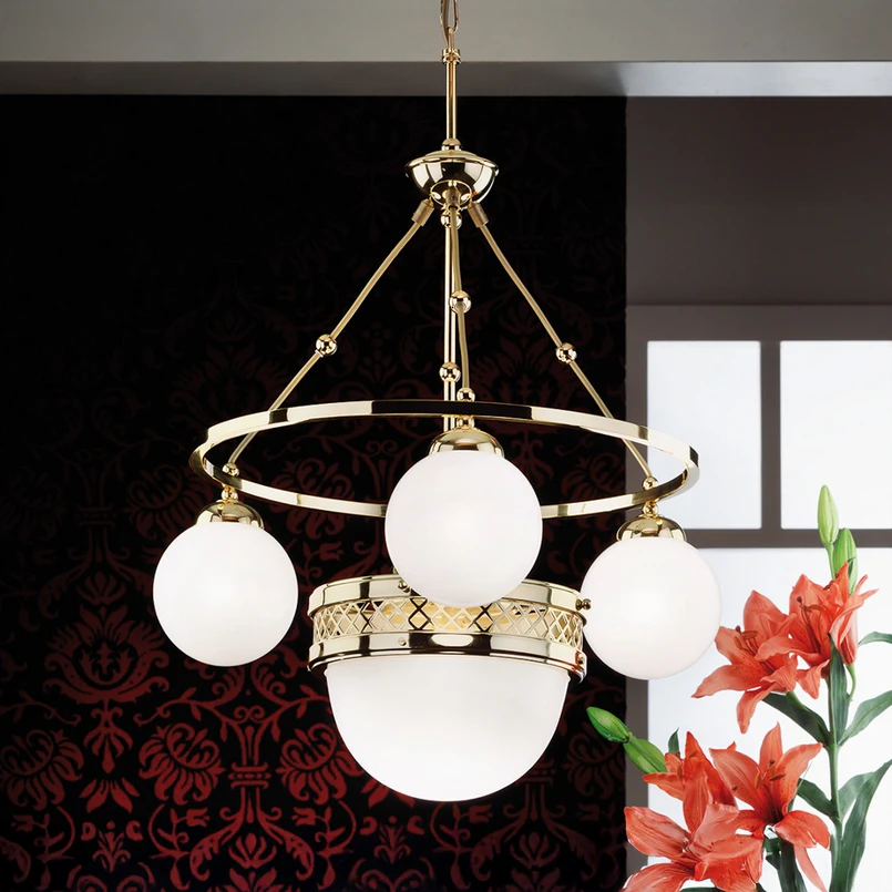 Schon der Name Alt Wien spielt darauf an, dass diese Hängeleuchte ein Tribut an vergangene Zeiten, in diesem Fall das Zeitalter des Jugendstils, ist. Da ist einem der Charme der Jahrhundertwende gleich ganz nah und die edle Ausstrahlung, die dieser Hängeleuchte zuteil wird, lässt sich keinesfalls leugnen. Zum besonderen Hingucker wird dabei der mit einem rautenförmigen Muster versehene Zierrand. Die opalen Glasdiffusoren präsentieren sich mit glänzender Oberfläche und tragen zu besonders angenehmen Lichtverhältnissen bei.