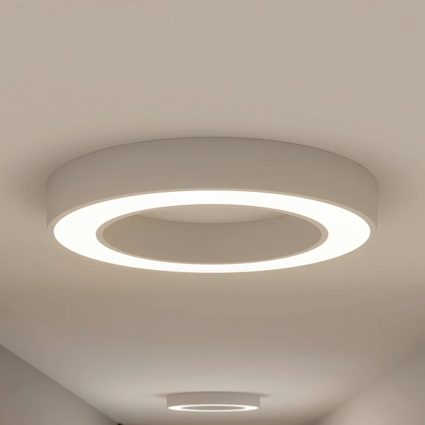Sharelyn ist eine Deckenleuchte, die ebenso schlicht wie modern erscheint und mit ihrer ringförmigen Gestalt auch schon mal als sehenswerte Neuinterpretation einer klassischen Küchenlampe gelten kann. Ihr Gehäuse ist komplett in Weiß gehalten und ein Diffusor aus robustem Polypropylen dient zur Abdeckung der LED-Leuchtmittel, die im Inneren des Ringes sitzen, und sorgt darüber hinaus für eine besonders gleichmäßige, blendfreie Ausleuchtung im Raum. Die LEDs zeichnen sich durch eine gute Effizienz und eine außerordentlich hohe Leuchtkraft aus und können daher längst nicht nur in der Küche, sondern auch in einem gewerblichen Umfeld eingesetzt werden, um zum Beispiel einen Flur zu erhellen. Je nach Verwendungszweck kann man die Lichtfarbe vor Anbringung der Leuchte über einen DIP-Schalter einstellen und entweder warmweißes oder universalweißes Licht erzeugen.