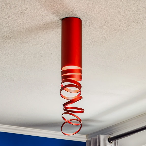 Es drängt sich geradezu die Assoziation mit einer Rolle Luftschlangen auf, bei der sich die einzelnen Schichten verselbstständigen. Das abstrahlende Licht trifft auf seinem Weg in den Raum auf jeden einzelnen Ring und projiziert so ein interessantes Spiel von Licht und Schatten.