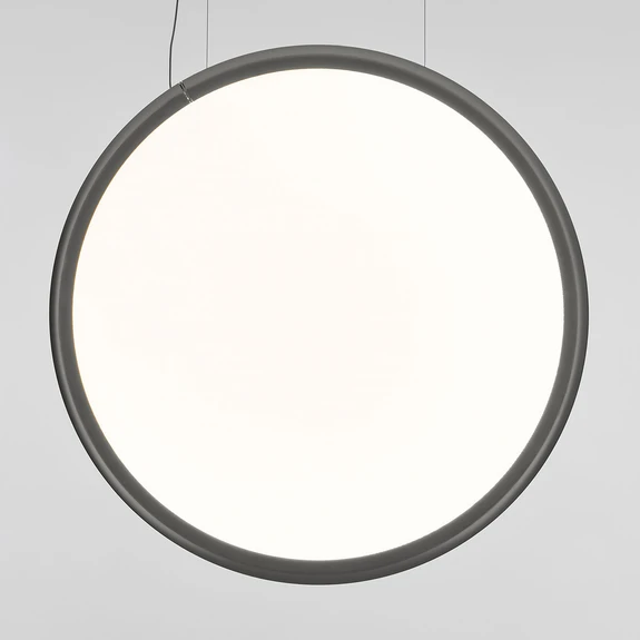 Höchste Effizienz und modernste Technologie vereint die LED-Pendelleuchte Discovery Vertical, indem der vollkommen transparente PMMA-Diffusor erst bei eingeschalteter Lichtquelle sichtbar wird. Umrahmt wird der Diffusor von einem schmalen Aluminiumring, dessen schmale Form von Fahrradfelgen inspiriert ist. Discovery Vertical ist durch die zurückhaltende Gestaltung optisch nicht aufdringlich und erhellt den Raum in beleuchtetem Zustand mit einem gleichmäßig verteiltem Licht, das vom LED-Streifen im Ring in den Diffusor geleitet wird.