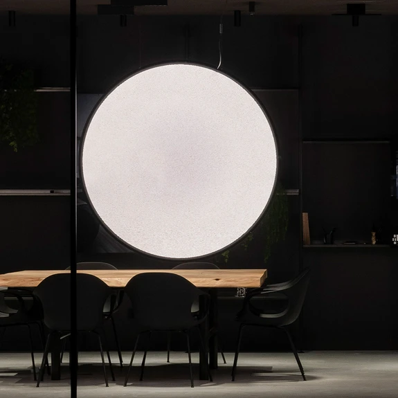 Der besondere Clou an der Hängeleuchte mit dem vertikal ausgerichteten Schirm ist, dass sie mithilfe der kostenlos herunterladbaren Artemide-App via Bluetooth vom Smartphone oder Tablet aus gesteuert werden kann.