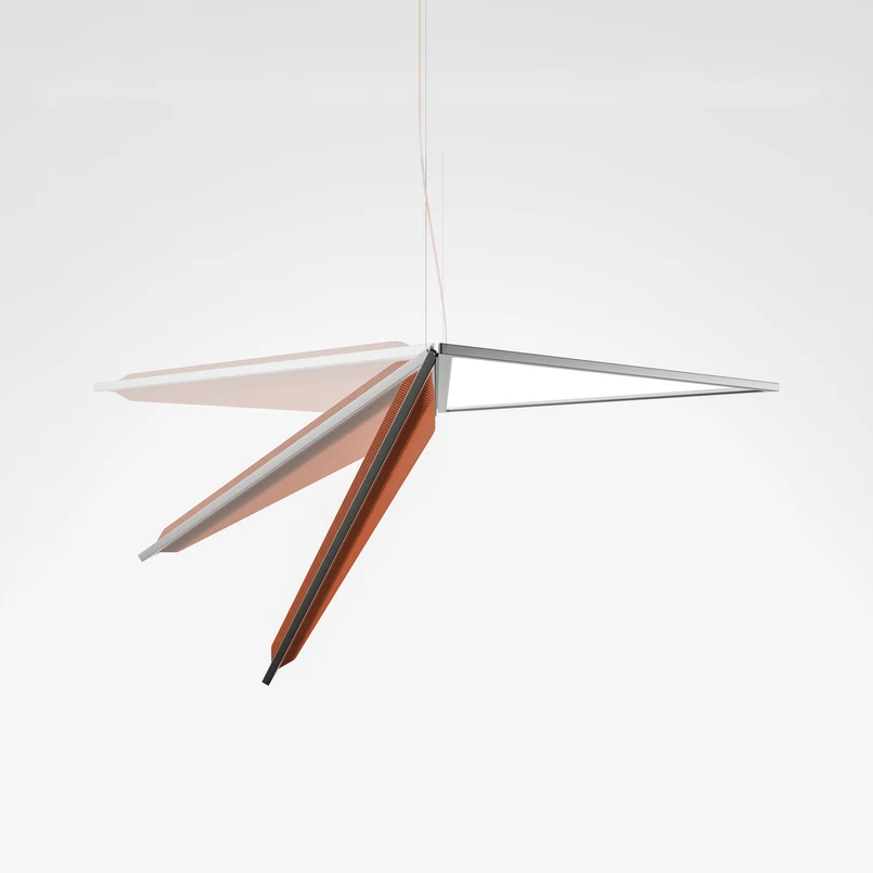 Die Hängeleuchte Flexia besteht zum Teil aus recycelten PET-Flaschen, zum Teil aus anderen recycelten Kunststoffen und ist mit einer Akustikplatte versehen, die die im Raum reflektierten Schallwellen absorbiert. Die transparente Abstrahlungsfläche in patentierter Discovery-Technologie dagegen ist für eine gleichmäßige, komfortable und diffuse Lichtemission verantwortlich. Die flexiblen Flügel der Leuchte mit einem Drehmechanismus ermöglichen auf die Interaktion mit der Umgebung abstimmbare Neigungen und Positionen. Die Hängeleuchte erfüllt die UGR-Normen für die Anwendung in Arbeitsumgebungen und ist daher bestens für den Einsatz in Büros oder Besprechungsräumen geeignet.