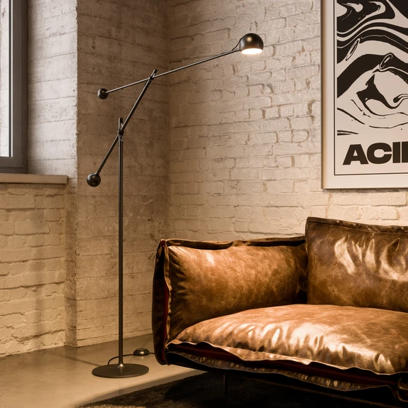 Das charakteristische Merkmal ist der beinahe kugelförmige Kopf aus Aluminium, der bei der dieser LED-Stehleuchte von zwei Gegengewichten an den beiden oberen Abschnitten des Stahlgestells in Balance gehalten wird. Neben den Gelenken an den Schnittpunkten der Arme ist der Kopf rundum drehbar, sodass die Ausrichtung der Lichtabgabe und das Design der Leuchte variabel anzupassen sind. Das Schalten und Dimmen des warmweißen Lichts, welches sich zudem durch eine gute Farbwiedergabe (CRI 90) auszeichnet, erfolgt über Taster am Kopf.
