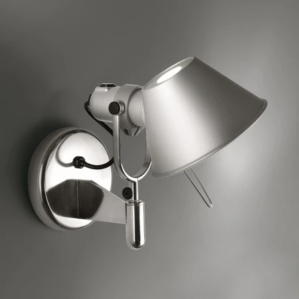 Mit glänzendem Aluminium-Wandsockel und der für die Tolomeo-Leuchten typischen Schirmgestaltung in matt eloxiertem Aluminium besticht die LED-Wandleuchte Tolomeo Faretto. Am Leuchtenkopf ist ein Dimmschalter für die Regulierung der Helligkeit angebracht.