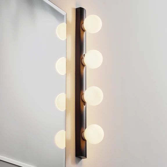 Cabaret kann sowohl horizontal als auch vertikal um einen Spiegel herum positionert werden und sorgt so mit den vier kugelförmigen Glasdiffusoren für helles, gleichmäßiges Licht welches nicht blendet.