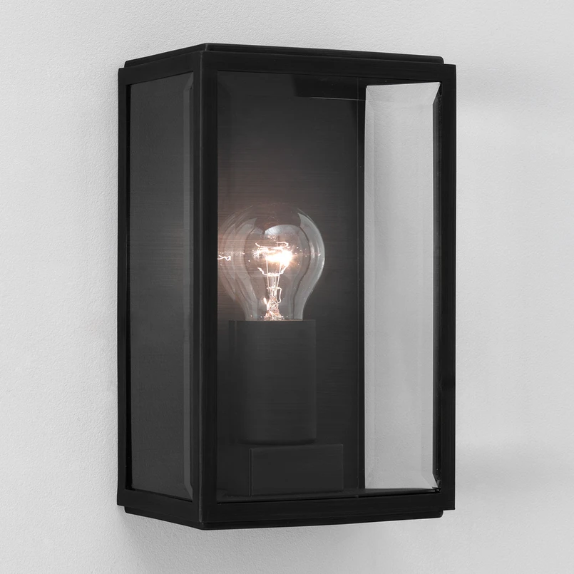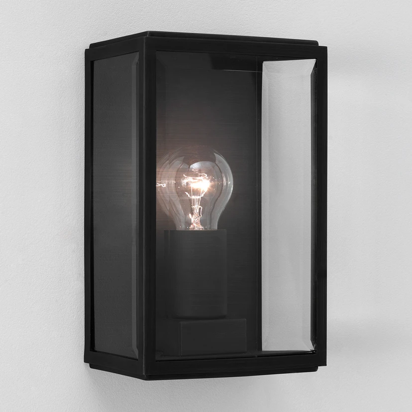 Die Außenwandleuchte HOMEFIELD SQUARE ist eine Art Wandschrank, der an allen drei sichtbaren Ecken offen ist. Das Glas ist der einzige Reflektor des 60 Watt Leuchtmittels, das zentral auf einem Sockel im Innern des Ganzen angebracht ist.
