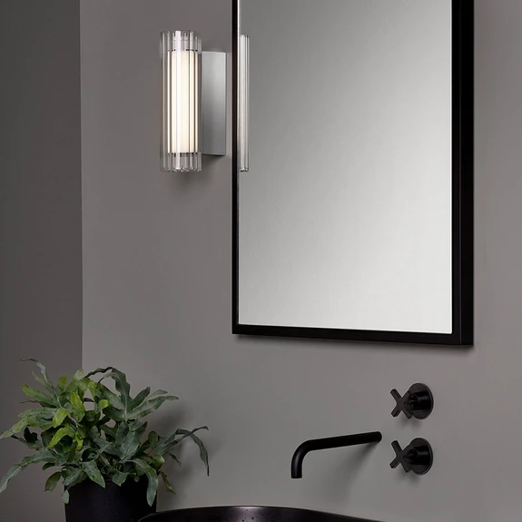 Eine rechteckige Wandhalterung aus Metall mit glänzend polierter, verchromter Oberfläche und ein daran angebrachtes, röhrenförmiges Element aus schönem Borosilikatglas in welligem Design mit transparenten Seiten und satinierter Mitte - das ist die hübsche LED-Wandleuchte io Wall, die sich perfekt für den Bereich rund um den Spiegel im Bad eignet, nicht zuletzt wegen des Spritzwasserschutzes. Auch als Paar angebracht, wirkt die LED-Wandleuchte sehr dekorativ. Die satinierte Mitte des Glasschirms entblendet das Licht der integrierten LEDs und lässt es sehr gleichmäßig strahlen.