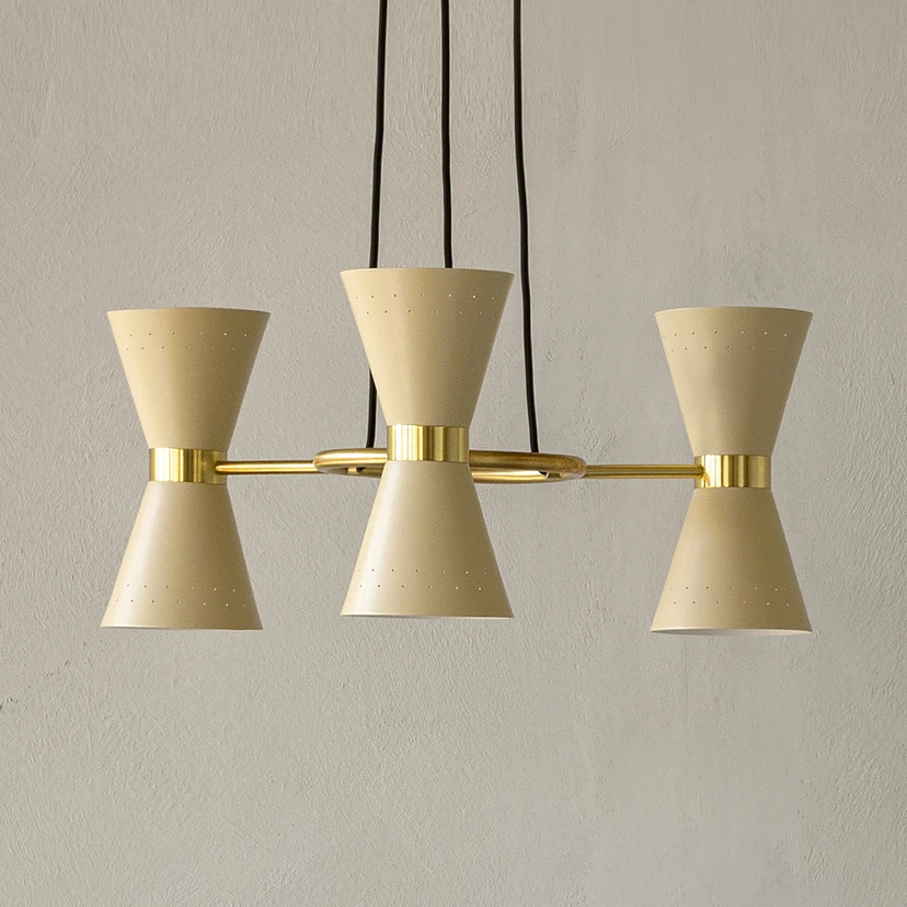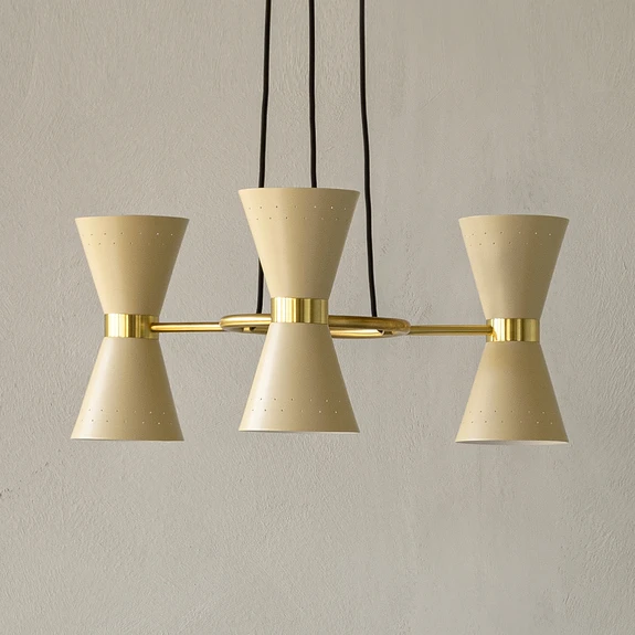 Collector besteht aus drei kleinen Schirmen, die jeweils nach oben und nach unten geöffnet sind und mit je zwei Leuchtmitteln bestückt werden müssen. Auf diese Weise liefert die Leuchte sowohl Raumlicht als auch gezielt nach unten gerichtetes Licht. Die feinen Messingdetails runden das zarte, cremefarbene Design der Leuchte ab.