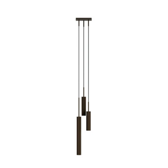Die Hängeleuchte Tubulaire begeistert mit ihrem eleganten, zeitlosen Design nicht nur in privaten Wohnräumen, sondern auch in repräsentativen Geschäfts-, Büro- und Aufenthaltsräumen. Unterhalb eines eckigen Baldachins hängen an Textilkabeln drei zylindrische Lampenschirme, die jeweils an der Unterseite ein GU10-Leuchtmittel aufnehmen. Die Schirme sind unterschiedlich hoch ausgeführt und in verschiedenen Höhen platziert. Die Fertigung erfolgt aus Aluminium, das im Strangpressverfahren eine lineare Struktur erhält. Abschließend wird das Material bronzefarben anodisiert.