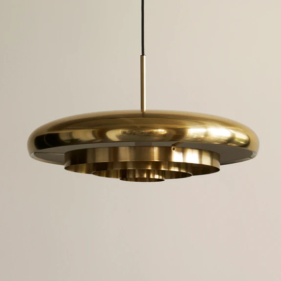 Der Schirm von Resonant besteht aus vier konzentrischen Schirmen, die eine blendfreie Lichtabgabe nach unten garantieren. Komplett aus poliertem Messing gefertigt, erstrahlt die Hängeleuchte auch tagsüber - ohne eingeschaltet zu sein - durch die Reflexionen auf der Schirmoberfläche in einem edlen, gold-gelben Schein.