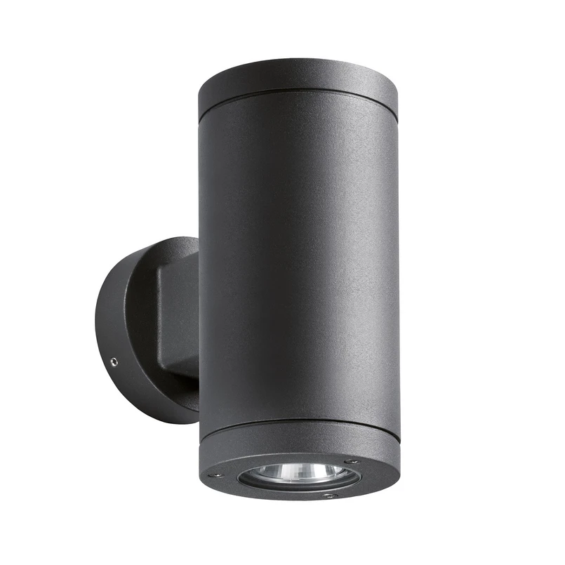 Die Außenwandleuchte 1060 besticht mit robuster Verarbeitung. Sie besteht komplett aus druckgegossenem Aluminium, die Lichtquellen sind mit Floatglas abgeschirmt. Oben und unten ist in den röhrenförmigen Schirm jeweils eine GU10-Fassung verbaut.