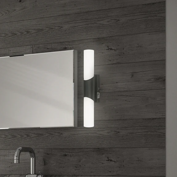 Die zweiflammige LED-Bad- und Spiegelleuchte Klak Brilo besitzt eine schwarze Wandhalterung aus Metall und zwei zylindrische Leuchtenschirme aus Kunststoff, die das universalweiße Licht blendrei abgeben. Sie kann sowohl waagerecht als auch senkrecht montiert werden. Dank der Schutzart IP44 ist die LED-Leuchte zudem ausreichend gegen Spritzwasser geschützt, womit sie problemlos im Badezimmer oder anderen Feuchträumen montiert werden kann. Klak Brilo kann über oder neben dem Spiegel für eine gute und harmonische Beleuchtung sorgen.
