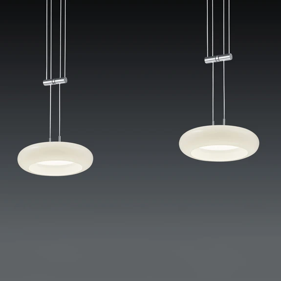 Bei der zweiflammigen LED-Hängeleuchte Centa setzt der Hersteller BANKAMP auf zwei separat hängende und steuerbare Glasschirme. Diese bestehen jeweils aus einer Scheibe und einem äußeren Ring aus mattem Glas, das im Betrieb gleichmäßig erstrahlt. Je ein Zugpendel dient zur Justierung der Abpendelhöhe und zur Befestigung am langen, rechteckigen Metall-Baldachin.