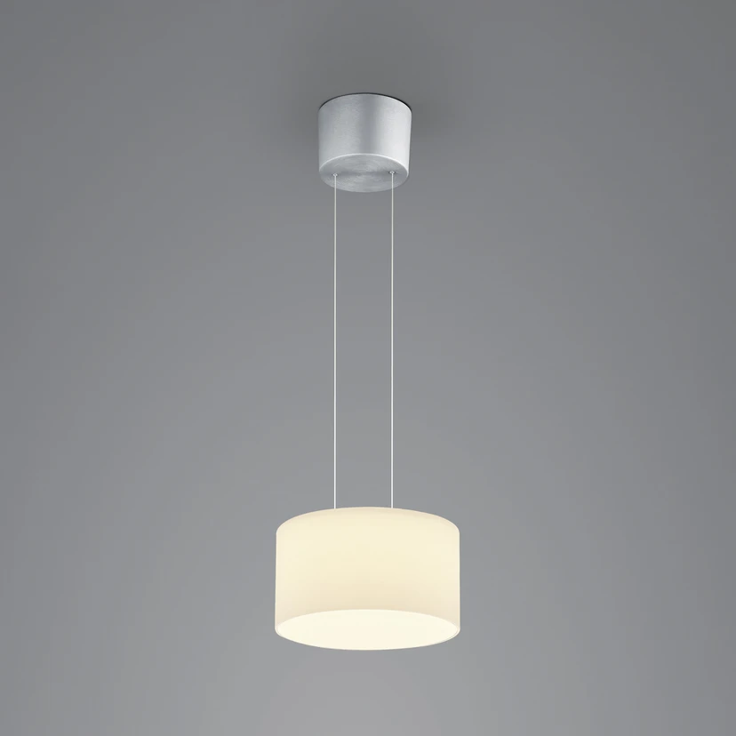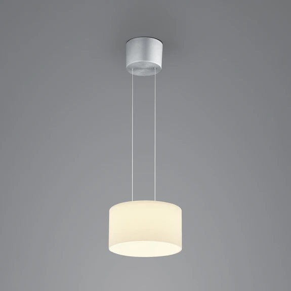 Die Abhängung der in Deutschland gefertigten LED-Hängeleuchte Grand Opal kann nicht nur bei der Installation eingestellt werden, sondern auch im Betrieb ist dies jederzeit möglich. Der Baldachin besteht aus eloxiertem Aluminium und trägt den aus opalweißem Glas hergestellten Schirm, der über zwei Seile an ihm aufgehängt ist.