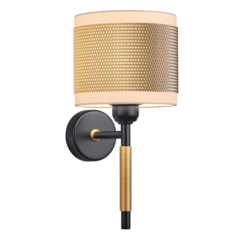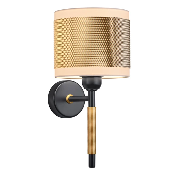 Behagliche Lichtstimmung und klassisches Erscheinungsbild - das macht diese Wandleuchte aus. Die runde Wandhalterung ist dezent und dunkel gestaltet, in der Mitte ist ein goldenes Detail platziert, aus dem der kurze Arm hervorgeht. Am Ende des Arms ist in Anlehnung an eine Fackel der Schirm montiert. Ein langer Stab führt nach unten und hält im oberen Bereich die Fassung samt Schirm. Fast der gesamte Stab ist mit einem Zwischenstück aus geriffeltem Messing verziert und wirkt wie eine Halterung. Der naturweiße Schirm aus Chintz verleiht der Wandlampe einen freundlichen, hellen Ausdruck und ist von einer zweiten Lage in ähnlich zylindrischer Form umgeben. Diese Lage besteht aus Streckmetall in messingfarbener Optik. Dadurch tritt das Licht gebrochen und homogen nach außen und erhellt sanft den Raum.