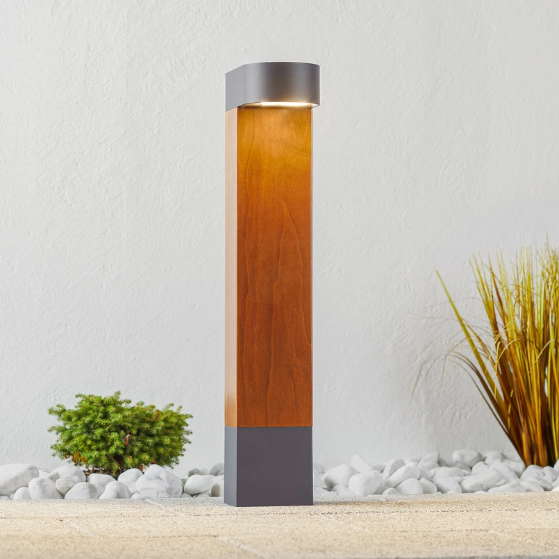 Eine Wegeleuchte in rechteckiger, schlanker Form, die zu beiden Seiten mit grauen Details abschließt - die LED-Pollerleuchte besteht zum größten Teil aus Accoya-Holz, das als besonders hochwertig, nachhaltig und widerstandsfähig gilt. Der Fuß und auch der abgerundete Leuchtenkopf bestehen aus Aluminium und stehen im direkten Kontrast zu dem sehr natürlichen Holz.