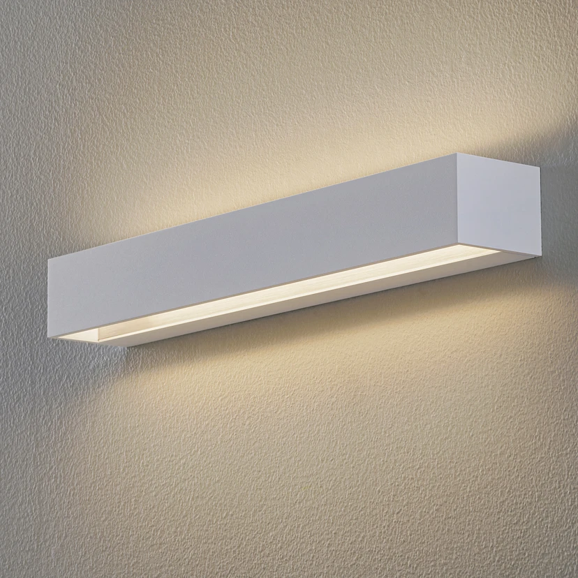 Die breite, quaderförmige Wandleuchte Studio Line gibt ihr warmweißes Licht nach oben und unten ab. Dabei befinden sich die LEDs abgeschirmt im Innern, sodass das Licht über die Wand indirekt den Raum erhellt. Die einfarbige, samt-matte Außenseite wird von einem metallischen Innern ergänzt; letzteres entfaltet besonders im Betrieb einen ansprechenden Glanz.