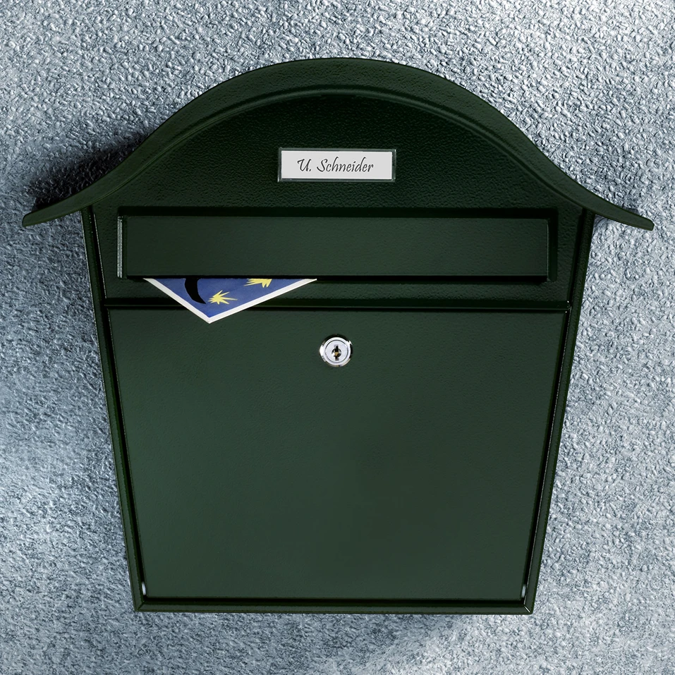 Das verzinkte Stahlblech des Briefkastens Holiday 5842 wurde farbig lackiert. Die Front mit Einwurf- und Öffnungsklappe wird durch das nach vorne überstehende, schwungvoll gestaltete "Dach" vor der Witterung geschützt, die Kantung vorne verhindert zudem das Heruntertropfen von Wasser.