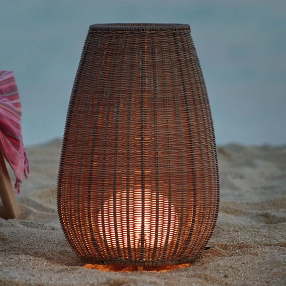 Das Design wird von dem bauchigen Korpus in Ratten-Optik dominiert, der aus Polyethylen besteht und von Hand gewoben wurde. Darin befindet sich eine weiße Kunststoffkugel, die die zwei E27-Fassungen vor jeglicher Witterung schützt. Zudem dient die Kugel als eine Art Diffusor, der das Licht der Leuchtmittel abblendet, sodass eine weiche und gleichmäßige Streuung des Lichts entsteht. Der gewobene Schirm fußt auf einem dreibeinigen Gestell aus Aluminium, das für die nötige Stabilität sorgt.