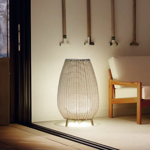 Der Schirm ist aus einem synthetischen Stoff handgewebt, der kugelförmige Diffusor besteht aus opalem Polyethylen mit UV-Schutz.