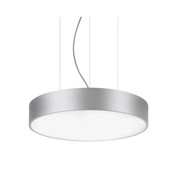 Biro Circle ist eine runde LED-Hängeleuchte mit flächigem Schirm aus Aluminium, der nach unten mit einer opalweißen Abdeckung aus Kunststoff geschlossen ist. Die Aufhängung der Leuchte an drei Stahlseilen ist kürzbar und verleiht dem Schirm eine leichte, fast schwebende Optik.