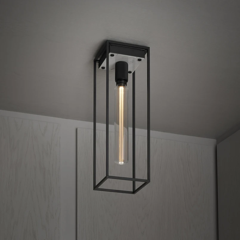 Weit nach unten ragt der quaderförmige, aus matt-schwarzen Metallstreben gebildete Käfig der LED-Deckenleuchte Caged Ceiling large. Er bildet den Rahmen für das spezielle Leuchtmittel, eine dimmbare LED-Lampe in Röhrenform, die speziell für diese Leuchtenserie entwickelt wurde und im Lieferumfang enthalten ist. Der Baldachin ist mit einer quadratischen Platte aus poliertem Marmor belegt, was der Leuchte einen edlem Touch verleiht.