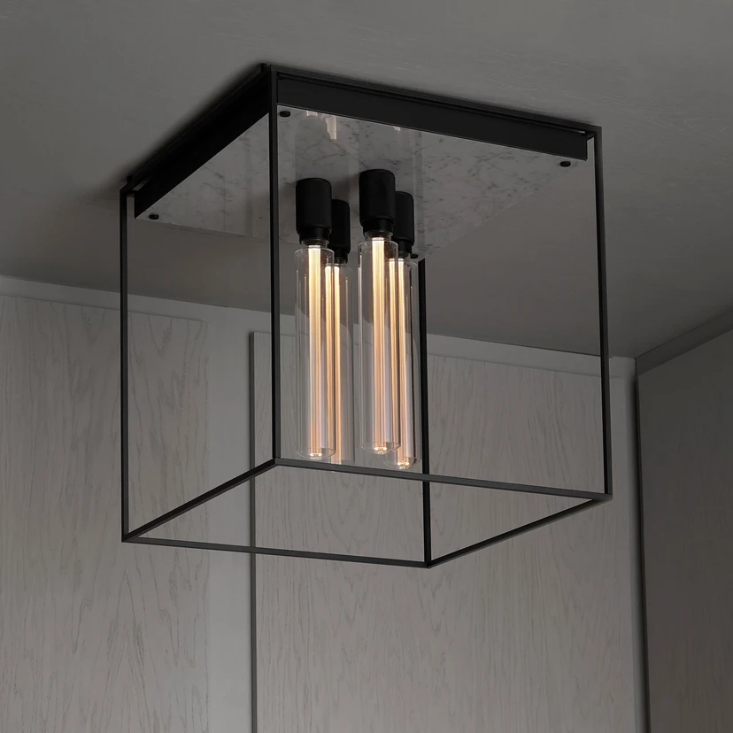 Die vierflammige Deckenleuchte Caged Ceiling 4.0 ist mit ihrer charakteristischen Gestaltung der passende Blickfang an der Zimmerdecke moderner Innenräume. Die Basis bildet ein quadratischer Baldachin, der mit einer polierten Marmorplatte abgedeckt und ist und auf dem vier dicht beieinander angeordnete E27-Fassungen sitzen. Nach unten lädt ein würfelförmiger Käfig aus schwarzen Metallstreben aus. In weitläufigen Eingangsbereichen oder auch über dem Ess- oder Wohnzimmertisch angebracht, setzt die Deckenleuchte Caged Ceiling 4.0 ein Statement. Passende LED-Leuchtmittel, die das Design komplettieren, sind über das Zubehör erhältlich.