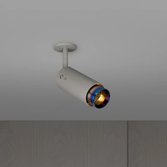 Der zylindrische, aus Edelstahl gefertigte Kopf des Deckenstrahlers Exhaust Spot sitzt an einer Arm-Halterung, die ein Drehen und Schwenken ermöglicht und so eine beliebige Ausrichtung des Lichts erlaubt. Im Lichtauslass befindet sich ein Wabenfilter, der die Blendwirkung mindert. Zudem ist sorgt ein gerillter, abgeschrägter Einsatz für eine Fokussierung des Lichts.