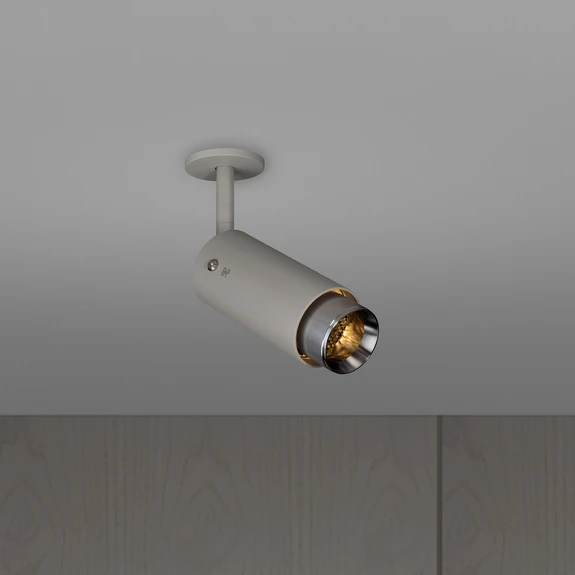 Der zylindrische, aus Edelstahl gefertigte Kopf des Deckenstrahlers Exhaust Spot sitzt an einer Arm-Halterung, die ein Drehen und Schwenken ermöglicht und so eine beliebige Ausrichtung des Lichts erlaubt. Im Lichtauslass befindet sich ein Wabenfilter, der die Blendwirkung mindert. Zudem ist sorgt ein gerillter, abgeschrägter Einsatz für eine Fokussierung des Lichts.