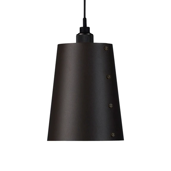 Prägende Merkmale der Hängeleuchte Hooked 1.0 large sind der als Kegelstumpf gestaltete Metallschirm, der mit vier sichtbaren Schrauben geschlossen ist, die darin sitzende Fassung im Kreuzrändelmuster, die oben leicht herausragt und der separate Aufhängungshaken, mit dem die Platzierung der Leuchte flexibel gewählt werden kann. Letzterer kann sowohl am Baldachin montiert als auch separat in der Decke verschraubt werden (M5-Gewinde). In einer Küche, im Ess- oder Wohnzimmer lässt sich so über einem Tisch oder einer Theke die Bekleuchtung ideal platzieren, auch wenn der Stromanschluss nicht direkt darüber liegt.