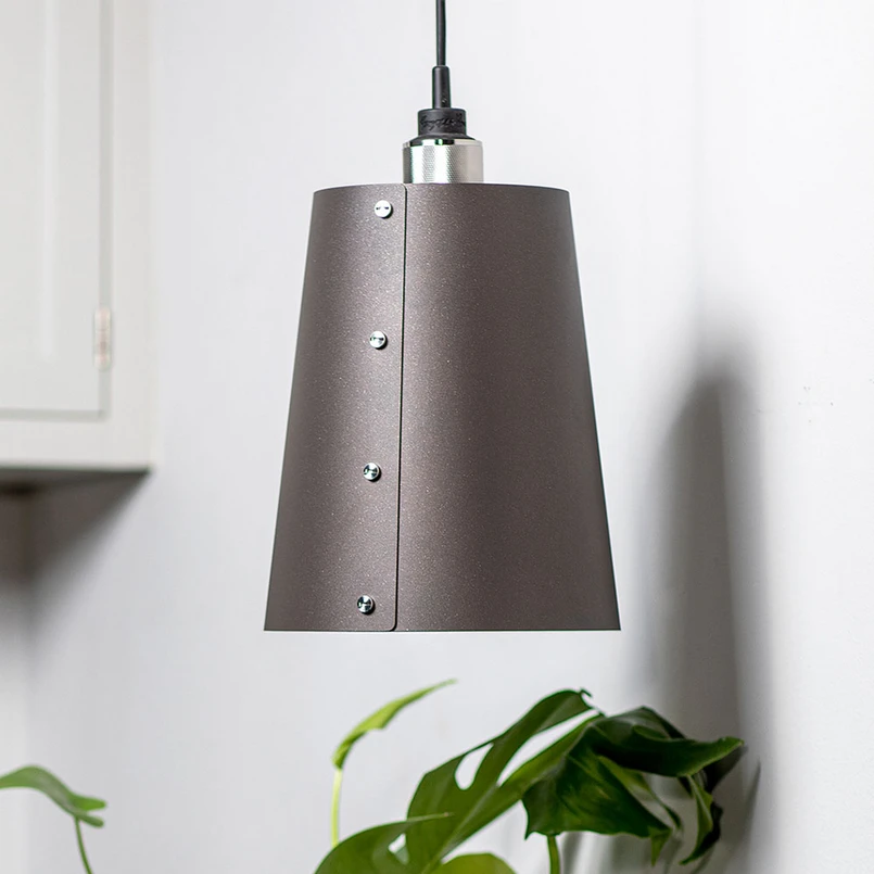 Prägende Merkmale der Hängeleuchte Hooked 1.0 large sind der als Kegelstumpf gestaltete Metallschirm, der mit vier sichtbaren Schrauben geschlossen ist, die darin sitzende Fassung im Kreuzrändelmuster, die oben leicht herausragt und der separate Aufhängungshaken, mit dem die Platzierung der Leuchte flexibel gewählt werden kann. Letzterer kann sowohl am Baldachin montiert als auch separat in der Decke verschraubt werden (M5-Gewinde). In einer Küche, im Ess- oder Wohnzimmer lässt sich so über einem Tisch oder einer Theke die Bekleuchtung ideal platzieren, auch wenn der Stromanschluss nicht direkt darüber liegt.