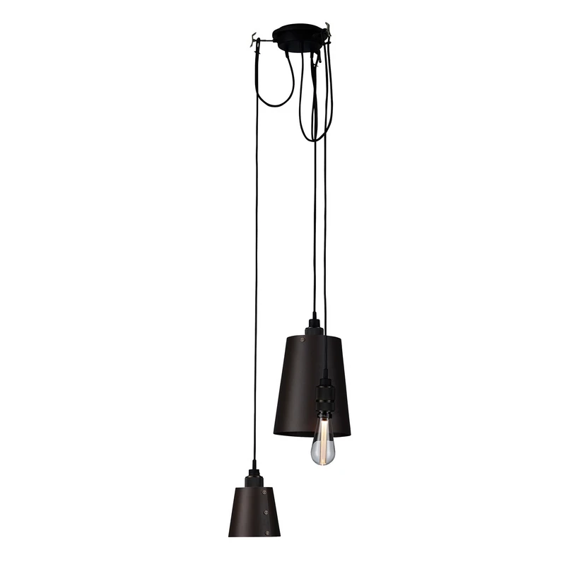 Hooked 3.0 mix ist eine dreiflammige Hängeleuchte, die aus einem runden Baldachin und drei Abhängungen besteht. Während eine Abhängung nur mit einer Fassung ausgestattet ist, sind die beiden anderen darüber hinaus mit Metallschirmen in unterschiedlichen Größen versehen. Die Schirme sind mit sichtbaren Metallschrauben geschlossen. Jedes der drei Pendel lässt sich mit den separaten, im Lieferumfang enthaltenen Haken aus massivem Metall separat aufhängen. Dies kann direkt am Baldachin oder dezentral an der Decke verschraubt (M5-Gewinde) erfolgen, sodass die Leuchte in den verschiedensten Arrangements gestaltet werden kann.