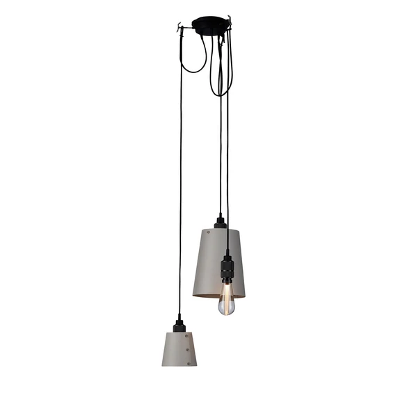 Hooked 3.0 mix ist eine dreiflammige Hängeleuchte, die aus einem runden Baldachin und drei Abhängungen besteht. Während eine Abhängung nur mit einer Fassung ausgestattet ist, sind die beiden anderen darüber hinaus mit Metallschirmen in unterschiedlichen Größen versehen. Die Schirme sind mit sichtbaren Metallschrauben geschlossen. Jedes der drei Pendel lässt sich mit den separaten, im Lieferumfang enthaltenen Haken aus massivem Metall separat aufhängen. Dies kann direkt am Baldachin oder dezentral an der Decke verschraubt (M5-Gewinde) erfolgen, sodass die Leuchte in den verschiedensten Arrangements gestaltet werden kann.