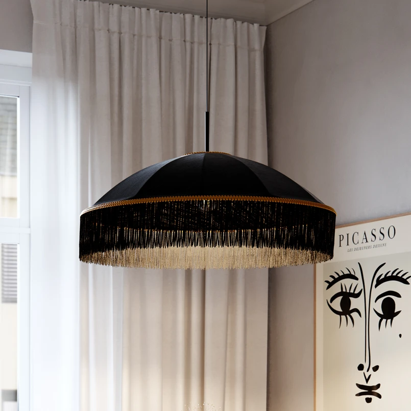 Die Pendelleuchte Francis vereint hochwertige Materialien wie Metall und Seide zu einem stilvollen Design, das jedem Raum eine besondere Atmosphäre verleiht. Mit ihren kunstvollen Fransen und der edlen Verarbeitung wird sie zum Blickfang in Wohn- und Essbereichen. Die Kombination aus robustem Metall und feiner Seide sorgt für eine harmonische Balance zwischen Stabilität und Eleganz.
