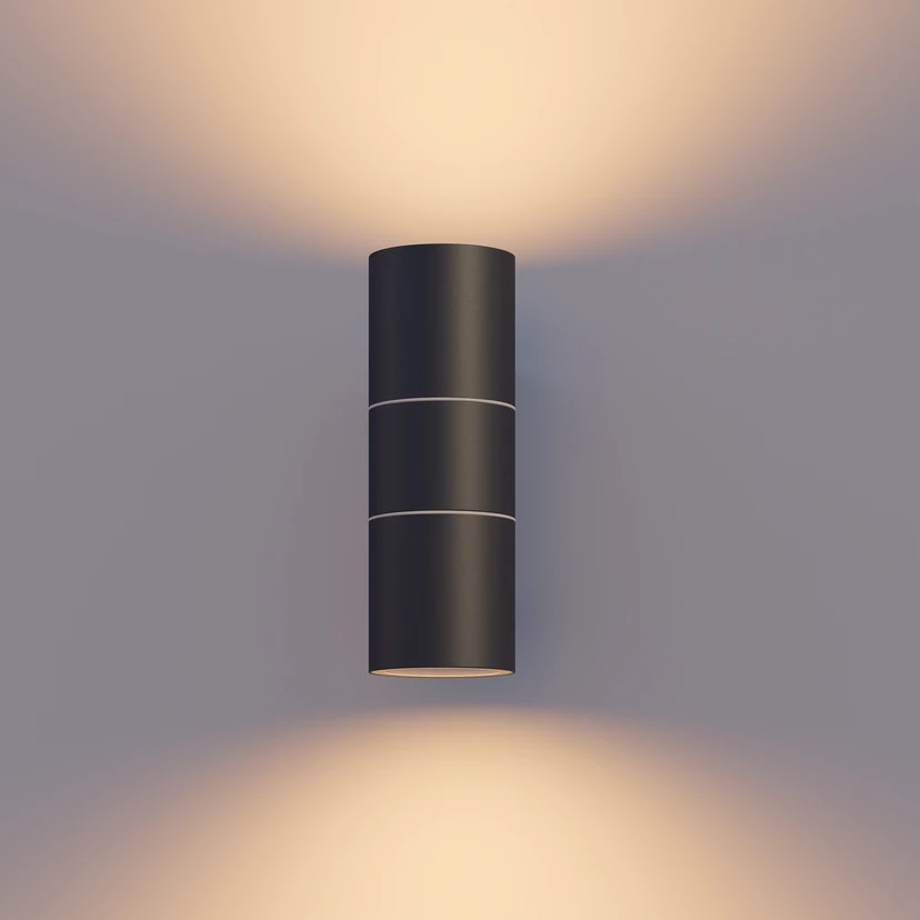 Diese Außenwandleuchte dient zur modernen Akzent- und Orientierungsbeleuchtung an Fassaden und Eingangsbereichen. Der aus Edelstahl 304 gefertigte Korpus ist in schlichter, einfarbiger Zylinderform gestaltet und mit etwas Abstand vor der Wandbefestigung angebracht. Hinter Glasabdeckungen an Ober- und Unterseite liegen GU10-Fassungen, die mit Leuchtmitteln der Wahl bestückt werden können.
