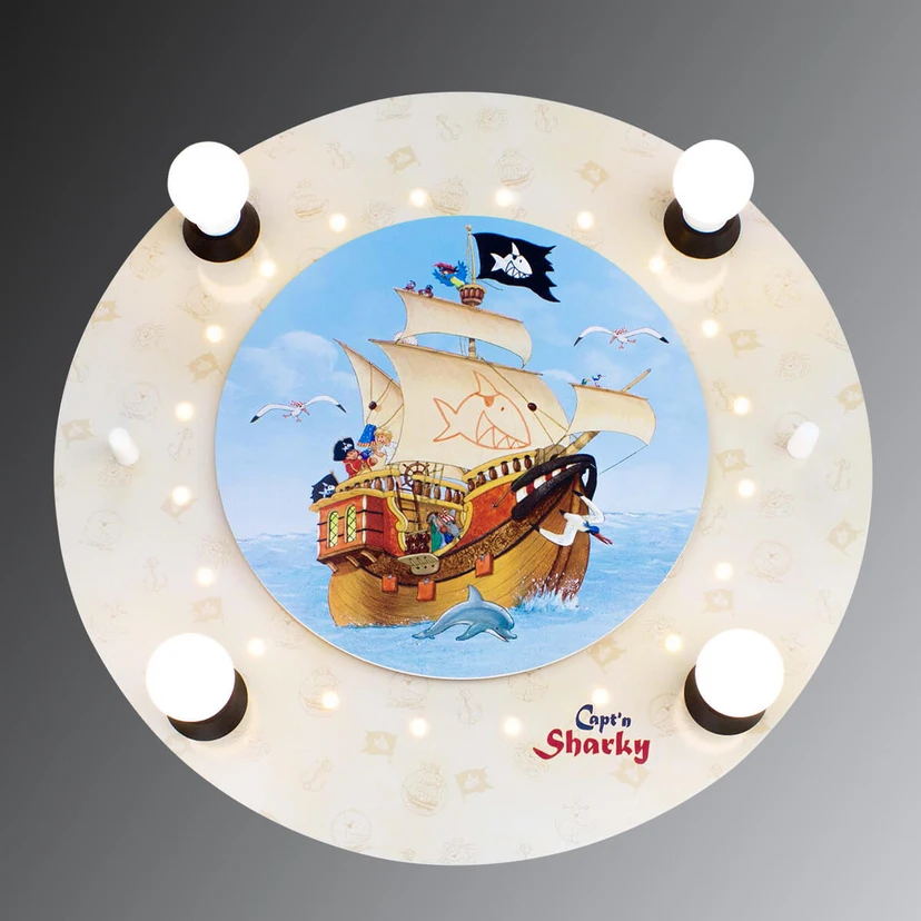 Die Wandleuchte Capt'n Sharky zeigt ein Originalmotiv der beliebten Kinderbuchreihe. Für kleine Piraten und Sharky-Fans ein absolutes Muss. Die Kinderzimmerlampe ist zudem mit einer Nachtlichtfunktion ausgestattet. 20 kleine LEDs sind am Rand verbaut und lassen sich einzeln zu einem Nacht- oder Schlummerlicht schalten. Dies funktioniert bequem über den Wandschalter. Die vier E14 Leuchtmittel sorgen zudem für eine ausreichende Helligkeit im Kinderzimmer. Diese sind jedoch nicht im Lieferumfang enthalten und müssen separat bestellt werden.