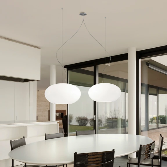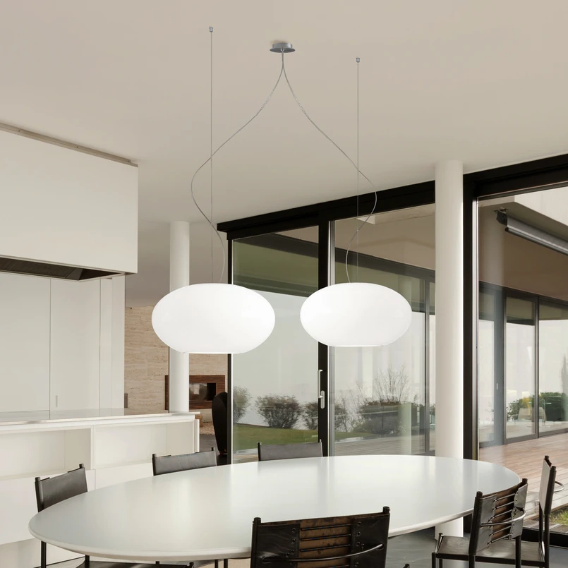 Aih hat die Leuchte zwar nicht neu erfunden, aber sie verbindet wiederkehrende Formen der Schirmgestaltung in höchst origineller Umsetzung mit innovativen optischen Details. So wurde kurzerhand aus einem edel runden Glasschirm ein erfreulich bauchiges und ausladendes Objekt, das sofort auffällt. Und weil das so herrlich freundlich und doch elegant wirkt, gibt es Aih in dieser Ausführung gleich zweimal. Doppelte Freude für den Betrachter ist eng verbunden mit doppelter Handwerkskunst, denn die Schirme wurden mundgeblasen. Dass sich die deutsche Manufaktur der wertigen Handfertigung verschrieben hat, sieht man den exzellenten Leuchten an und man darf sich freuen, Objekte mit einzigartigem Charakter für die Beleuchtung zu nutzen. Die zweiflammige Hängeleuchte ist wie gemacht für die größere Tafel, die sie sicher stilvoll ins rechte Licht rückt. Der ansprechende Abstand der Schirme erzielt eine den gesamten Tisch umfassende Ausleuchtung und erfreut mit wohnlichem Zonenlicht.