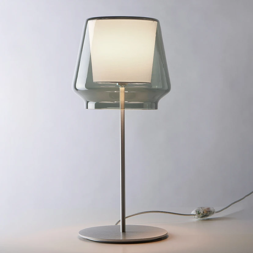 Stil und Eleganz zaubert die Tischleuchte Aleve in den Wohnraum, die sich aus einem zierlichen Leuchtengestell und einem hübschen Schirm in Doppeloptik zusammensetzt. Das Gestell wurde aus Aluminium gefertigt und von Hand gebürstet, so dass eine wunderbare Struktur zu erkennen ist. Der Schirm hingegen setzt sich aus einem mundgeblasenen Klarglasschirm und einem darin sitzenden Textilschirm zusammen, der dem Gesamtbild eine unverfälschte und reine Optik schenkt. Das Licht wird durch den Textilschirm sanft gefiltert und ringsum in die Umgebung gestreut, so dass eine behagliche sowie blendfreie Lichtstimmung entsteht, die sich durch Abschwächen der Helligkeit mittels Schnurdimmer noch steigern lässt.