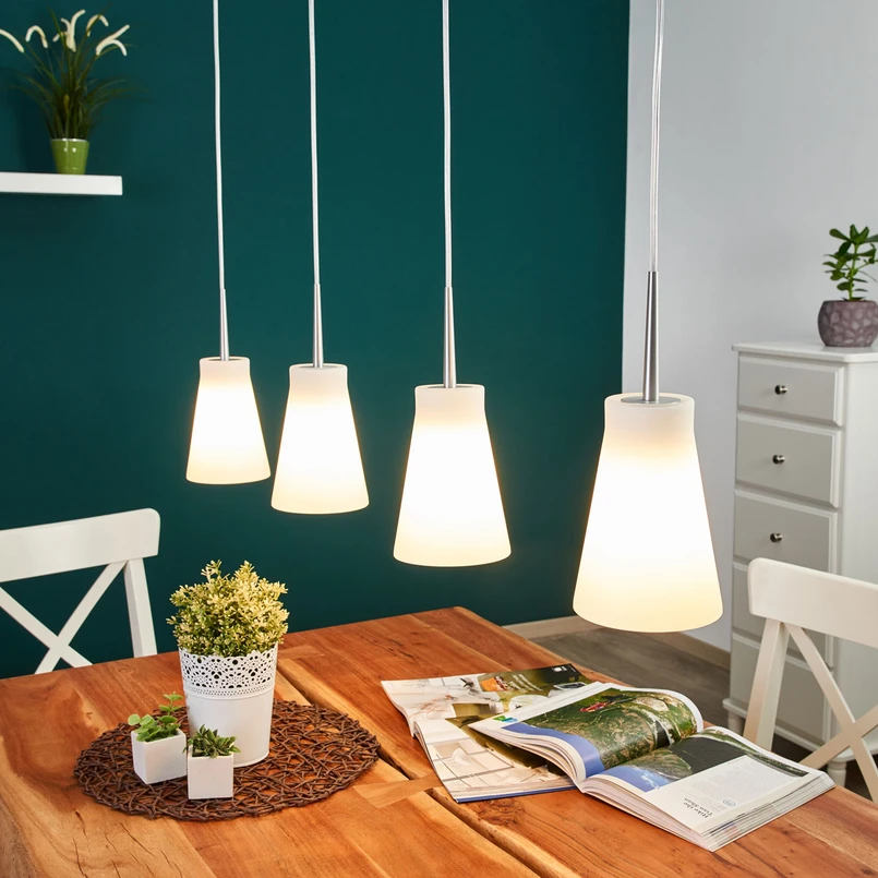 Die Hängeleuchte Momo ist perfekt zum Einsatz über allen langen Esstischen geeignet. Durch die nach unten geöffneten Leuchtschirme wird der Bereich darunter optimal ausgeleuchtet, was gerade beim gemütlichen Zusammensitzen zu den Mahlzeiten, bei einem Spieleabend oder zu ähnlichen Anlassen von Vorteil ist. Die Deckenhalterung und die Haltedrähte sind schmal und minimalistisch gestaltet. Sie sind aus gebürstetem Aluminium handgefertigt. Die schlichten Leuchtschirme wurden handgeblasen. Ihre Durchmesser betragen 12 cm, die Höhe jeweils 17 cm. Nach Belieben können die Schirme mit LEDs oder Energiesparleuchten in die E27 Fassungen bestückt werden.