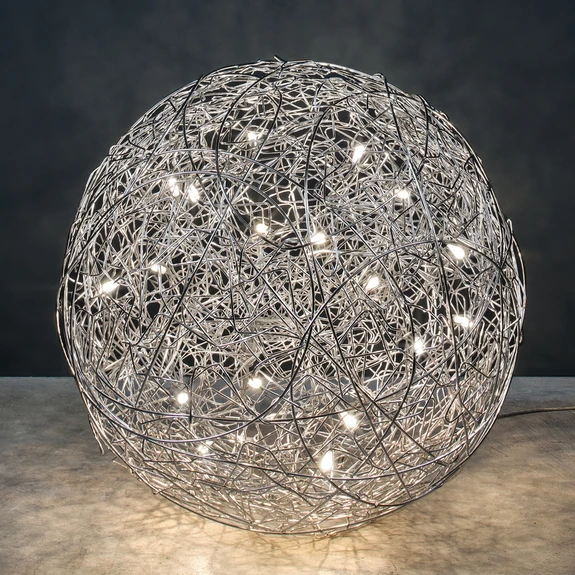 Ob auf einem Balkon, in einer Pool- bzw. Lounge-Area oder im heimischen Garten - die LED-Bodenleuchte Fil de Fer sorgt einfach überall für den absoluten Wow-Effekt und eine atemberaubende Lichtatmosphäre. Sie ist das Werk des italienischen Designers und Firmengründers Enzo Catellani und entstand in reinster Handarbeit aus einer Vielzahl dünner Aluminiumdrähte. Diese wurden zu einer Kugel zusammengefügt und im Inneren mit warmweiß leuchtenden LEDs bestückt. Sie sorgen in eingeschaltetem Zustand nicht nur für eine magische Gesamtoptik, sondern zaubern auch eine warme sowie urgemütliche und sehr einladende Lichtatmosphäre.