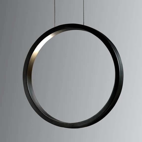 Durch den ringförmigen Leuchtenschirm, der aus Aluminium gefertigt ist und durch seine dezente Drahtseilabhängung einen schwebenden Eindruck hinterlässt, wird der Esstisch zum absoluten Blickpunkt des Inventars. Das Licht wird auf der Innenseite des Rings durch modernste LEDs erzeugt und diffus und blendfrei in das umliegende Areal gestreut. Insgesamt entsteht dadurch nicht nur eine überaus angenehme Lichtstimmung, sondern auch ein faszinierendes Lichtspiel.