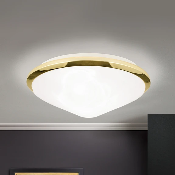 Schöne Deckenleuchte Corella, in 3 verschiedenen Farben und 2 Größen erhältlich. Diese Leuchte passt perfekt in jedes Ambiente durch ihr dezentes Design. Der äußere Ring in der Farbe messing, chrom oder titan gibt der Leuchte die ganz bestimmte Note.