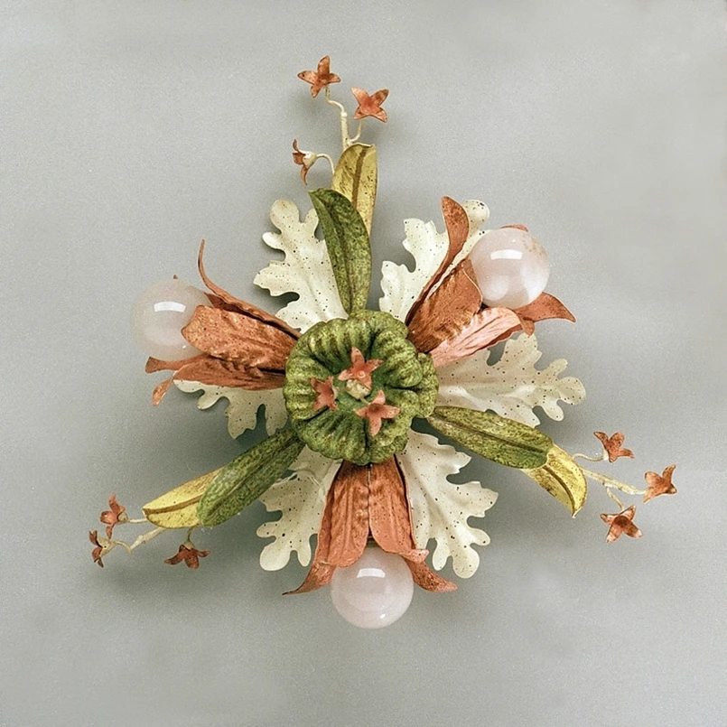 FERRARA - eine schmückende Deckenleuchte im Florentinerstil - besteht aus Blütenkelchen, Blättern und Blütenrispen aus Metall, die in warmen Pastelltönen rot, grün und beige gefärbt sind. Ob an der Decke oder an der Wand montiert - FERRARA wirkt überaus dekorativ und stellt einen Farbtupfer dar.