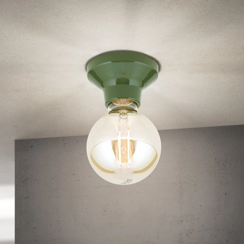 Ohne Schirm, jedoch im unverwechselbaren Retro-Design erscheint die Deckenleuchte Frost. Bei Frost liegt der Fokus auf einer runden Deckenhalterung aus glasierter Keramik, die eine E27-Fassung beinhaltet. Je nachdem, welches Leuchtmittel eingesetzt wird, verstärkt sich der dekorative Retro-Look.