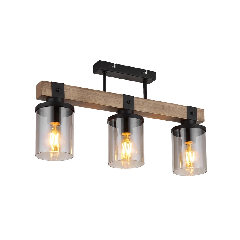 Deckenleuchte Lila mit Holzbalken, dreiflammig