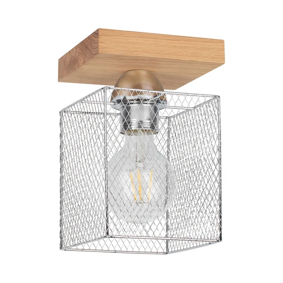 Die in quadratischer Grundform gestaltete Deckenleuchte Norman Wood zeichnet sich durch die Kombination gegensätzlicher Materialen aus. Der metallische Schirm, in dessen Zentrum das Leuchtmittel platziert wird, ist an den Seitenflächen mit einem Gitter versehen. Dessen kühler, mechanischer Charakter steht in Kontrast zum flachen Deckenhalter, der aus hellem Holz gefertigt ist.